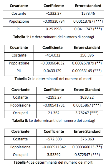 Per raffinare l’analisi abbiamo poi valutato l’effetto congiunto delle variabili economiche e demografiche sugli indicatori di incidenza del virus. In termini tecnici si direbbe valutare l’impatto delle variabili demografiche “controllando” per quelle economiche. Da questa operazione di raffinamento arrivano i risultati più interessanti. Infatti, se regrediamo il numero dei contagi – oppure quello dei morti – in ogni regione sul numero di abitanti e sul valore del PIL – oppure sul numero di lavoratori occupati – osserviamo che il fattore demografico inverte il segno della sua correlazione, mentre la variabile economica al contrario lo conserva nettamente. I risultati delle diverse regressioni sono riportati nelle Tabelle 1, 2, 3 e 4.