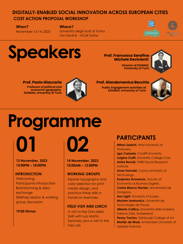 As part of the project “Preparing a COST Action proposal on DSI in the European cities“, funded by UniTo – MUR Grant for Internationalisation, the DIGGEO@ESOMAS lab is hosting the Partners’ Meeting on the 13 & 14 November in Turin.