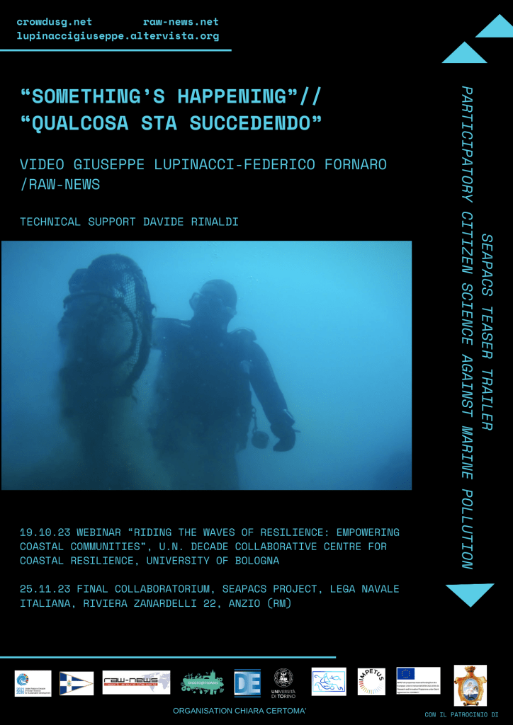 The teaser of the European project SeaPaCS – Participatory Citizen Science Against Marine Pollution (coordinated by Prof. Chiara Certomà of the University of Turin – Laboratory DIGGEO@ESOMAS, ESOMAS Department – and funded by the European Project IMPETUS) – will be screened for the first time on October 19 at 5:00 PM during the webinar “Riding the Waves of Resilience: Empowering Coastal Communities” organized by the Decade Collaborative Centre for Coastal Resilience (DCC-CR) of the University of Bologna, with the support of the Climate Change Communication Award (CMCC). After four months of intense field activities, and while the analysis of the data collected in view of the final presentation at the “Collaboratorium” on November 25, 2023 continues, the new video (produced by Raw-News, shot by Giuseppe Lupinacci with the direction of Federico Fornaro and the support of Davide Rinaldi of the “Capo d’Anzio Diving Center”) presents the problem of plastic in the sea, now present at all levels of the food chain, which is increasingly evident to everyone and is profoundly changing ecologies, economies and our relationship with the sea.