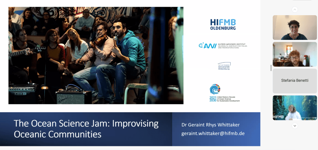 Geraint Rhys Whittaker (Helmholtz Institute for Functional Marine Biodiversity + Alfred Wegener Institute for Polar and Marine Research) will entertain us on the 15th of March at 5pm about his work on the UN Ocean Decade-endorsed activity “The Ocean Science Jam: Improvising Spontaneous Oceanic Communities” (https://hifmb.de/transfer/art-science/ocean-jam-night/).