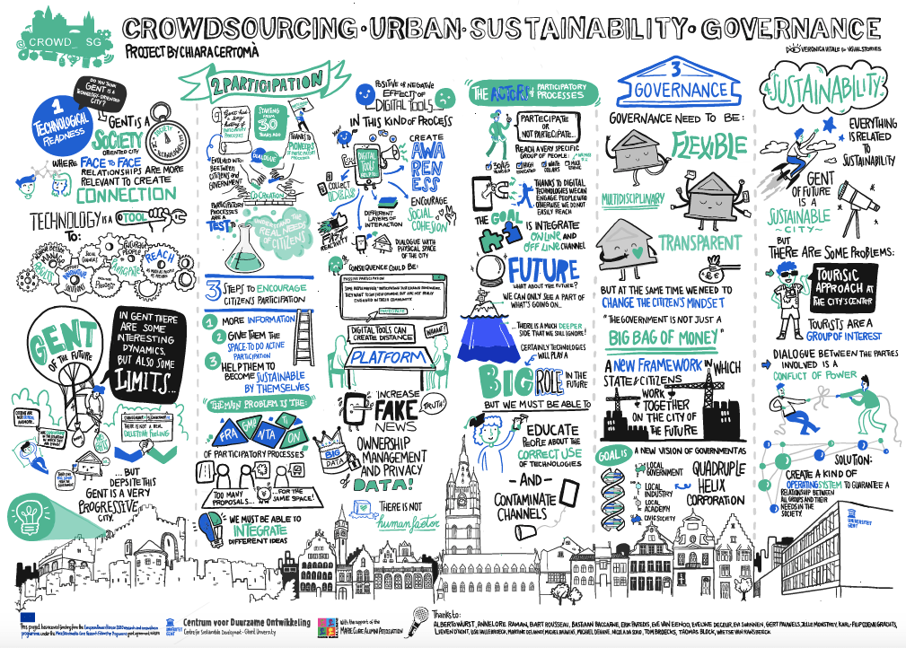 Particularly, crowdsourcing can impact on traditional governance model by reviewing the mode of interaction between governing bodies, research institutions, business and social actors. This can generate citywide technological leap-frogging and community-based decentralised knowledge and policy production systems; and can lead to the attainment of sustainability goals by fuelling the integration of environmental, social and economic priorities in the urban governance agenda. Ghent is a dynamic and innovation-oriented city, experimenting original solutions in sustainability governance, and aiming at pioneering green-infrastructure development, ethical and sustainable consumption and business models, ecosystem services valuing, and social cohesion and participation. Sitting on the critical geography tradition, CROWD_USG uses Actor-Network Theory and Scenario Building for modeling current material-semiotic fluxes in USG; and for prefiguring future social, political and economic development determined by the introduction of crowdsourcing processes. CROWD_USG project envisages: