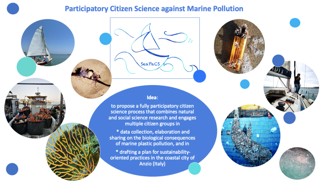 SeaPaCS is intended to raise awareness about the consequences of marine plastic pollution on local biodiversity and to trigger transformative local action for sustainability-oriented behaviours in the coastal small city of Anzio (Rome). It answers two complementary research questions: What microbes are present in the Mediterranean plastisphere (i.e. the living microbial community on plastics and microplastics in marine environments) and how are they affecting the biodiversity of the Mediterranean ecosystem? How can the experience of sea workers and amateurs help decrease plastic debris and promote sustainable behaviours? SeaPaCS combines natural and social science research and engages multiple citizen groups (migrant fishermen cooperatives, students, associations, sailors and divers, scientists, video makers and photographers) in “collaboratorium” meetings, training sessions and co-production of tools for collective sea-going expeditions in the coastal waters (for plastic samples collection, microbial life analysis, interviews and video-documentation of new biological formation and fishing plastic practices), organisation of outreach activities (e.g. video and photo expositions, media coverage, redaction of follow-up plan).